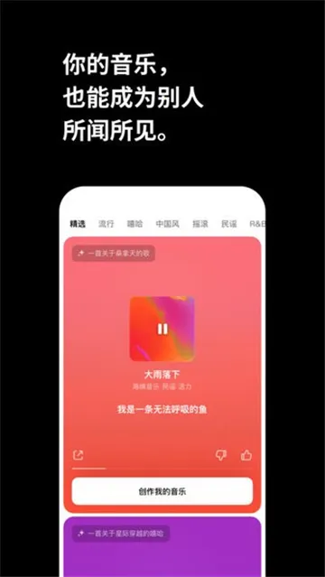4. 自定义创作:拥有丰富自定义功能,可随心选择曲风、心情和音色等,打造完全属于自己的个性化音乐。