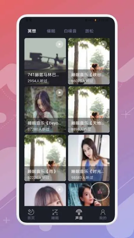 3. 精心汇聚自然场景音效、舒缓轻音乐、治愈睡前故事等丰富内容,随心打造专属催眠环境。深度整合鸟鸣、海浪等多种优质声音元素,提供多样助眠声音选择。