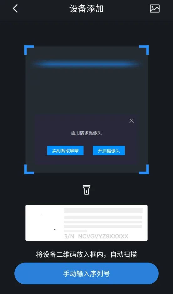 根据二维码判断上是名片导入还是设备序列号,如果为名片直接添加成功,如果为序列号判断设备类型添加至对应的模块,如果不能识别设备类型,需要你手动选择。