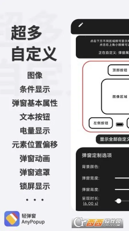 除了上方的弹窗文字内容及图片,Bear Pop-up还提供了丰富的可自定义选项,包括弹窗背景色、文字颜色(上左右文字颜色、*电量显示文字颜色)、弹窗尺寸(显示长宽)、弹窗呈现时长、左右侧按钮应用跳转、*圆角大小、*弹窗样式(方向)、*动画循环次数及*电量显示开关 。带'*'属性为登录授权用户可定制属性。