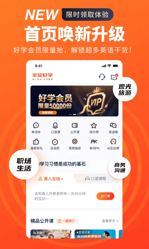 平安好学英语优势显著。操作简单方便,轻触屏幕即可快速完成操作,省时省力。内容实时更新,免费课程视频丰富,让学生随时在线学习。它能提供优质教育服务,课程信息全面。还具有主题单词本,满足多方位单词需求;能激发英语潜能,探索奇趣世界;干货不断,利用碎片时间学英语。可为学习者匹配适合的外教与教材,提供针对性指导和场景化学习,帮助用户轻松提高英语听说读写能力。
