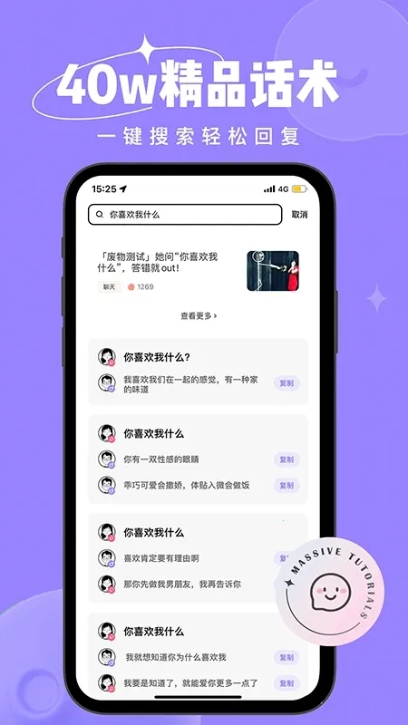 搜索便捷:可搜索海量词语,无论是4000聊天词语还是40万聊天话术,查找粘贴即可轻松回复对方,快速找到满意的聊天内容。