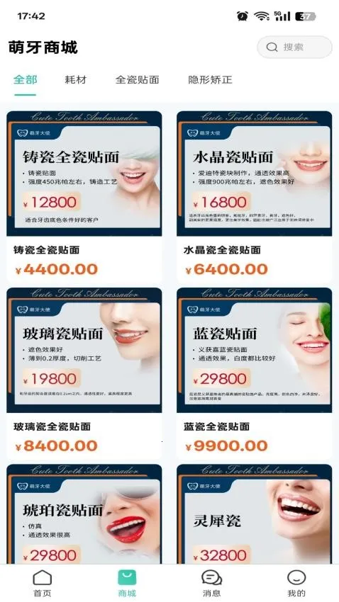 如果你想知道萌牙大使是不是全国连锁,这里有相关信息供你参考。萌牙大使app能满足你不少需求呢。它有萌牙商城,能让你轻松查找并购买各种口腔耗材、隐形矫正、全瓷贴面等商品,分类展示方便你按类别找货。还有科普视频,帮你学习口腔健康知识,更好呵护口腔。支持快速咨询牙科医生,解答口腔疾病疑问。能收藏感兴趣的商品,方便随时购买。平台客服随时在线,解决常见问题。其特色包括精选商品、价格透明、都是正品,咨询方便,能精准选购,购物省心便捷。你可以通过简单操作进入商城购买商品,比如打开软件同意协议登录,进入商城选商品,再到详情页下单。有了它,了解口腔护理和购物都更轻松啦。