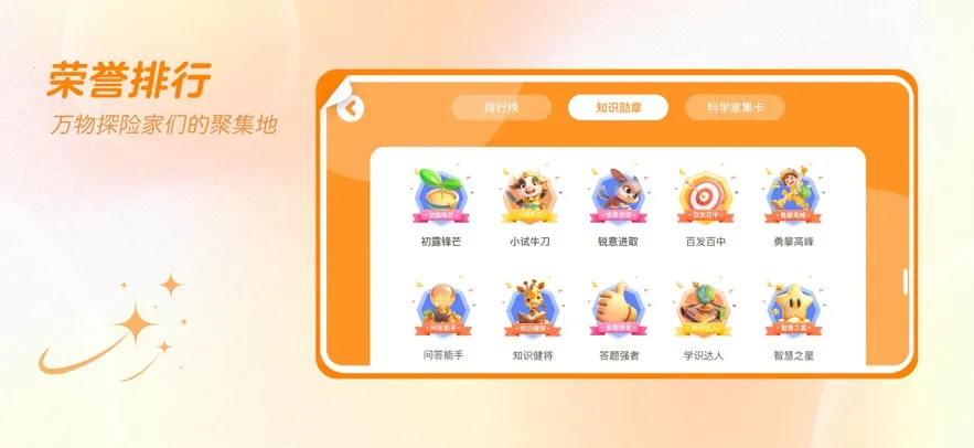 4. 全程激励:荣誉排行榜、知识勋章、科学家卡片等激励系统,有效增强孩子学习动力。