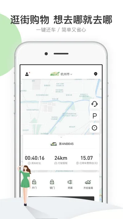 2. 一键租还:租车、寻车、控车、还车及支付等环节全程线上完成,提供全程线上化租车服务。