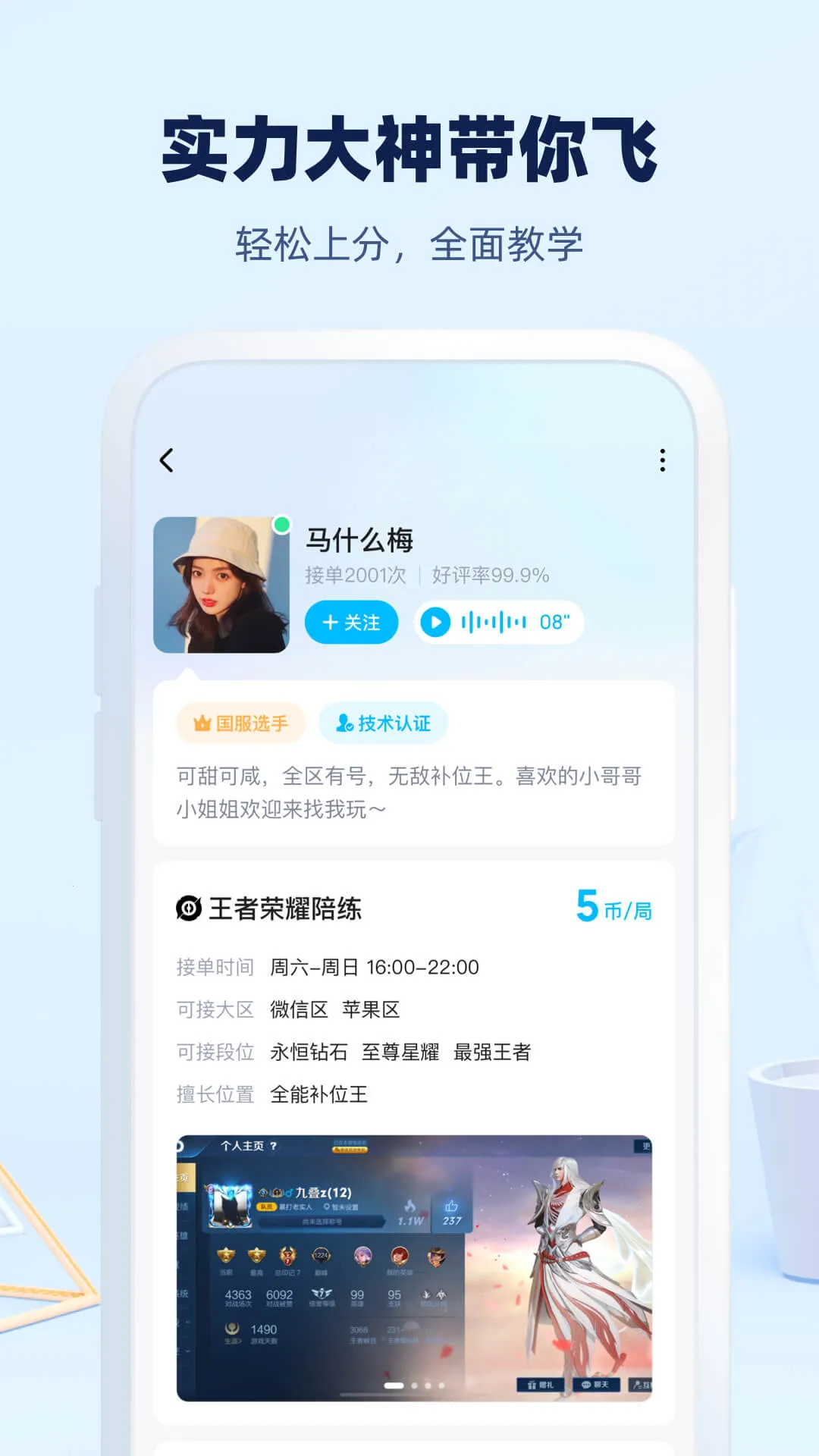 2. 随时在线一键下单,了解不同大神战绩更简洁。