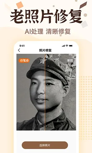 老照片画质修复优势显著。它效果好速度快,能修补模糊、损坏或像素化的老旧图片,让记忆清晰如初。功能实用操作简单,是随时随地处理老旧破损照片的得力助手。无论是发黄老照片、旧设备拍摄的,还是网络低分辨率画质图片,都能修复。可通过人工智能上色,精准还原场景。还能自行调整清晰度,无损放大分辨率,清晰保存照片,全方位满足用户对老照片修复的需求,留存珍贵回忆。