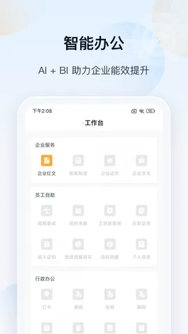 办公协作全面优化:集合 OA 办公流程、员工通讯、知识管理等功能,是完整移动办公解决方案,支持多端设备访问,操作简洁。
