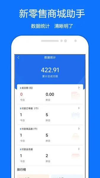 新零售商城助手2025官方正版可助用户在手机端轻松管理多店铺,了解运营数据,含金额订单统计等功能。界面整洁,有专业管理方式,能智能分析数据,一站式管理节省时间,还有多种营销推广工具,提升管理效率。