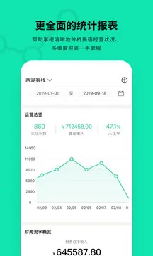 3. 全面统计报表:从不同维度统计民宿运营数据,清晰呈现每日营收、订出间夜及入住率等,助掌柜分析经营状况。