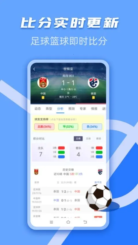 4. 比分实时更新:足球篮球赛事动态比分直播,确保不会错过任何关键比分。