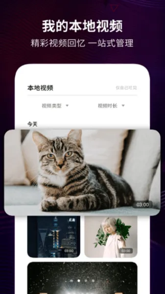 4、本地视频管理完善:自动扫描生成智能相册,支持多种分类浏览,还有基础编辑功能可裁剪时长与添加背景音乐。