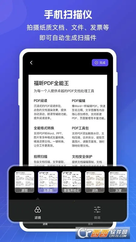 福昕PDF全能王安卓版是一款强大的PDF办公工具,集编辑、转换、扫描、OCR识别、注释、合并拆分等功能于一体,支持多语言,能处理多种格式文件,还可云端存储共享,让手机处理PDF更便捷。