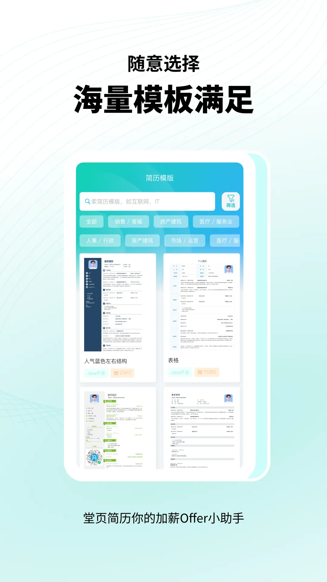 堂页简历模板是一款助力求职的软件,有丰富模板,覆盖多行业职位。操作简洁,能自定义。提供求职指南,适配不同行业。有即时预览、多样证件照尺寸等功能,还可导出多种格式,不断优化保持竞争力。