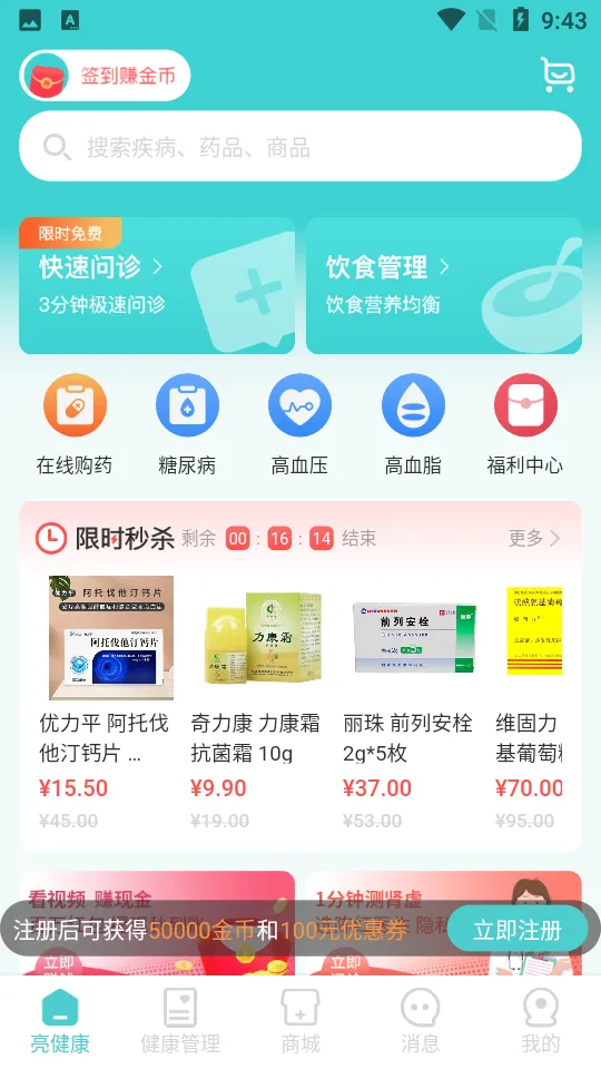 亮健康是亮健集团旗下资源打造的一款专业正规网上购药平台。它致力于为用户提供在线专业医生咨询、线上购药、健康知识、健康管理等专业健康服务。用户下载注册后会根据自身情况配备一名健康顾问,可随时线上咨询健康问题。这里有免费义诊活动,能0元问诊全科疾病,权威医生在线专业解答。平台上还有大量专家视频讲解病理、实用健康知识、用药安全常识等,帮助用户学会科学养生和慢病康复。亮健康品类齐全,购药便捷,折扣多多,还有福利中心。总之,亮健康能让用户看病省心、买药放心,是一款值得信赖的健康服务平台。