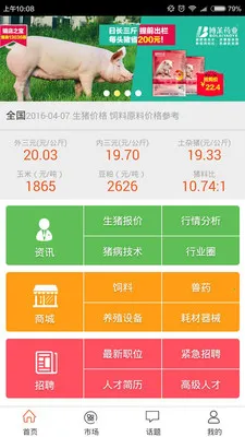 软件优势众多。能提供行情分析,多方面分析市场行情,在线查看生猪报价,还可查历史报价数据。设有行业圈,方便动态交流和信息沟通。有专业养猪商城,能在线购买养猪相关产品。首页详细显示生猪报价等行情,“我的”栏目有用户个人养殖详细信息资料。此外,还提供全国养猪行业资讯报道、畜牧商城、人才招聘等,让养猪更简单高效快乐,助力养殖户提升养猪水平,实现高效养殖。