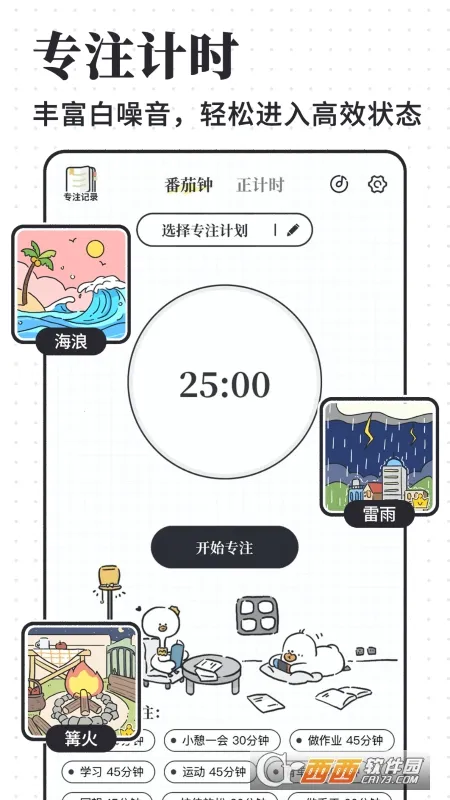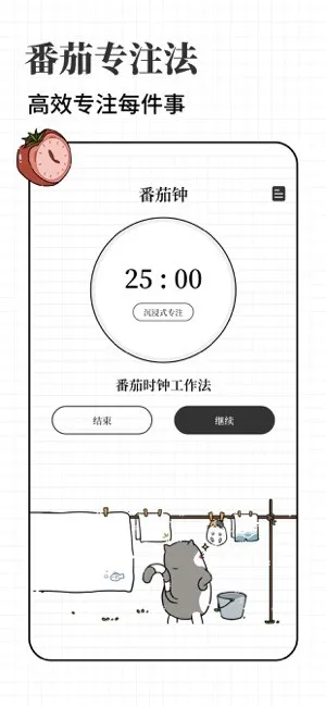 番茄时钟,专注高效:结合番茄工作法,用定时器分割出25分钟工作时间和5分钟休息时间,简约风格助力您在专注计划中有条不紊地进步。