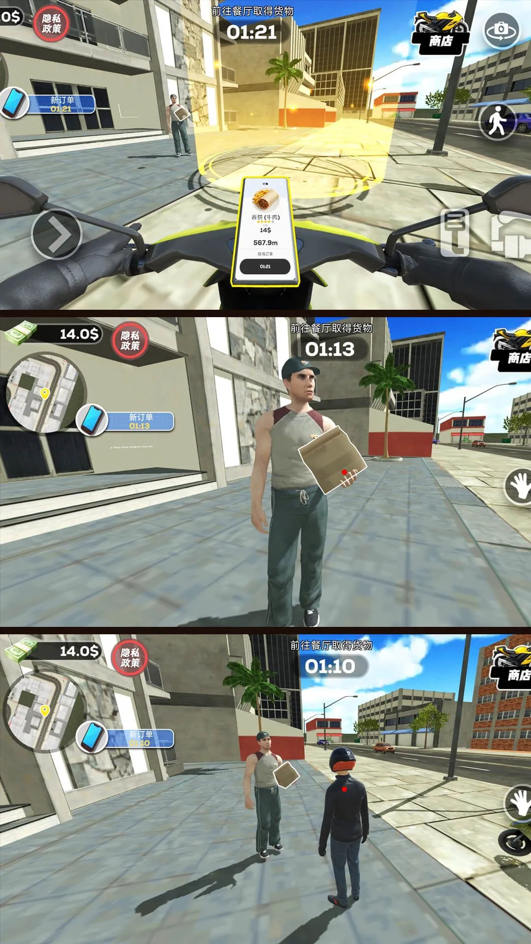 这款游戏能让玩家真切体验外卖骑手的日常。奔波于城市各处送餐,要熟悉街道路线以节省时间,提供优质服务获好评拿奖励,还能升级摩托车提高效率,每天都过得很充实。游戏采用卡通画风,在规定时间内完成送达任务,十分考验驾驶技术。它高度还原了外卖骑手接单取餐、规划路线及应对突发状况的过程。有多种自行车可升级,从普通单车到电动摩托,提升配送效率。面对拥堵交通、恶劣天气和刁钻顾客等,每个订单都是全新挑战。玩法丰富,速度与态度都影响小费,不同区域有独特订单任务,还有多种订单类型和活动。开放世界设计可自由探索城市找隐藏任务和奖励,能给玩家带来极具挑战和乐趣的游戏体验。