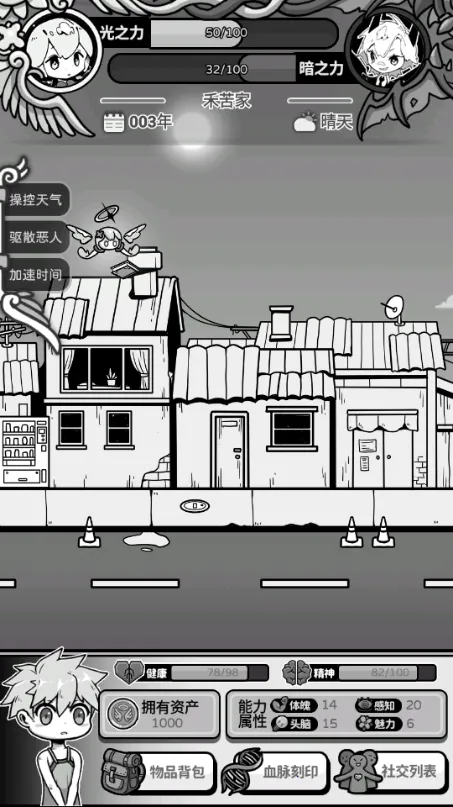 天使模拟器游戏玩法丰富,玩家要为倒霉短命鬼提供庇护,面临诸多选择。地狱会派人索取庇佑人性命,玩家可选择对抗或搞好关系。还能改写庇佑人的命运,依靠光之力施展神迹干预人生,光之力不足可找信徒祈祷补充。游戏有多种职业,如厨师、猎龙人等,玩家能帮助庇佑人在重大事件中抉择,还会触发随机事件。角色方面,像梦美、璃曦、默涵等各具特色,有不同的遇见场景、好感变化及结婚后的属性影响等。游戏采用黑白动漫画风,人物形象随年龄变化。从整体来看,这是一款充满策略与趣味的模拟游戏,能让玩家体验独特的天使庇护之旅,感受改写命运的乐趣。