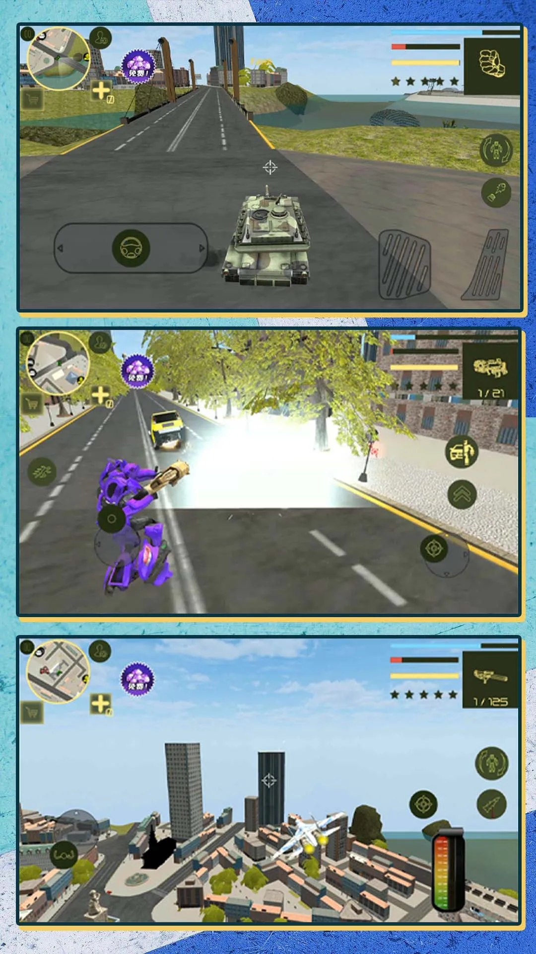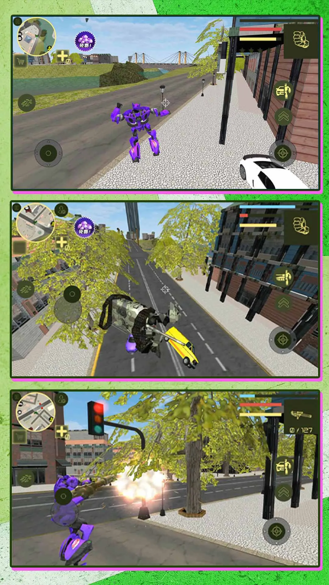 1、多样化机甲变形:游戏中有多种机甲可供选择,每个机甲都有不同技能和战斗模式,玩家还能先尝试驾驶再做选择。并且机器人可自由切换不同形态,每种形态威力各异,还能随时将机甲人变形为酷炫跑车,快速穿越城市躲避危险。