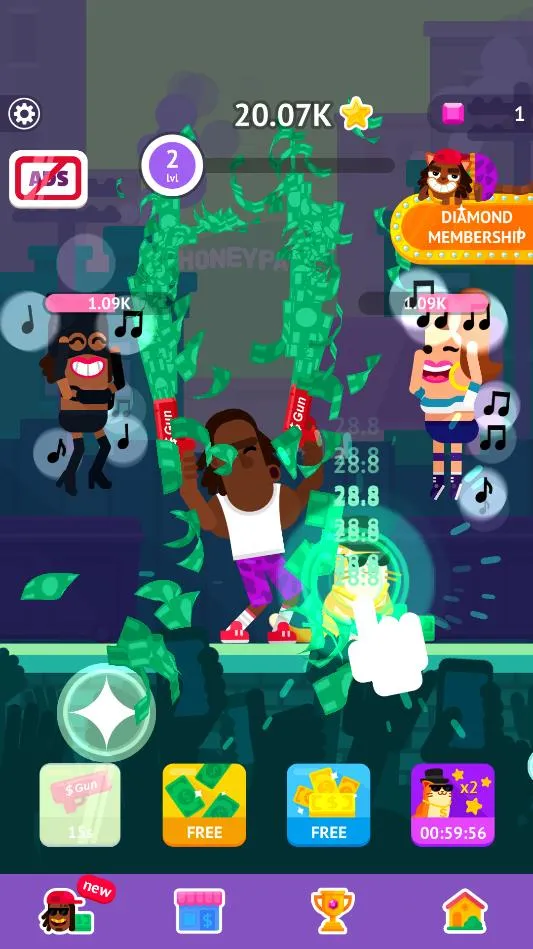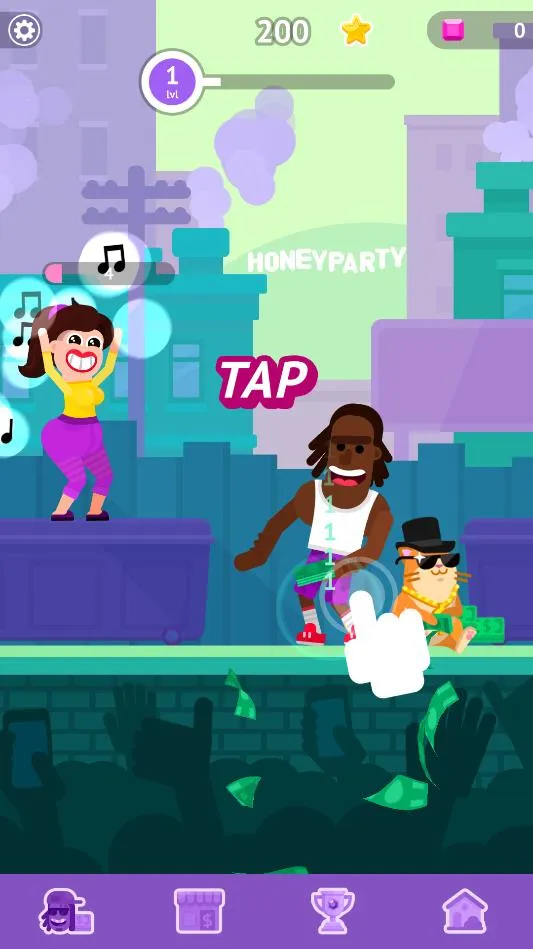 派对大师是趣味点击休闲游戏,玩家化身派对明星与舞者PK,轻点屏幕对战,进程中对手变强需长时间点击。可升级角色、改造房子,还有装扮小游戏、吉他改造等玩法,画面音乐佳,操作简单,各年龄段皆宜。