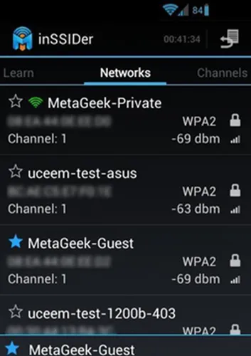 inSSIDer是一款超棒的WIFI检测软件。它能帮你检测和分析附近所有的WIFI热点,查看热点的各种基本信息,像MAC地址、网络名称、无线信号强度、信道、加密方式、无线传输速率等,超全面。