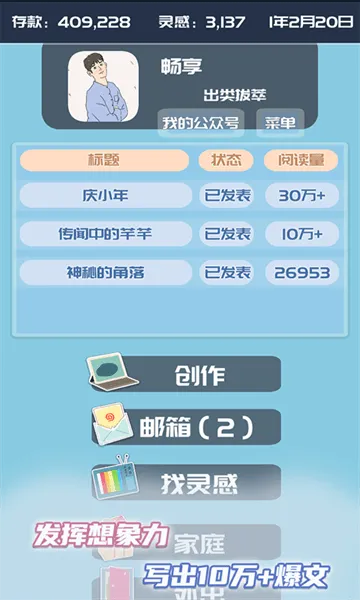 想知道公众号在哪找?玩《我的公众号》游戏就对啦!在这游戏里,你能化身叛逆富二代开启公众号创业路。从创建公众号开始,挖掘灵感写文章赚收益,还能兼顾生活养萌宠约好友。它真实还原自媒体流程,能广告变现与粉丝互动。游戏有多元养成经营模式,新颖题材搭配清新画面。新手开局有3000元,先刷灵感,钱到1000左右开始创作,前期别急着在公众号发,先投书刊涨粉。中前期金钱够了买宠物获取灵感,提升写作能力。中后期换神兽,提高写作能力,灵感够了发布作品,阅读量超百万稿费大增。后期买便宜房子,持续买神兽,用公众号助理涨粉后发作品赚钱。这游戏能让你体验经营公众号的全过程,轻松解决找公众号相关问题,快来试试吧!