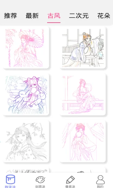 1. 海量丰富素材:提供大量不同风格的填色素材,涵盖古风、二次元等多种类型,满足多样创作需求。
