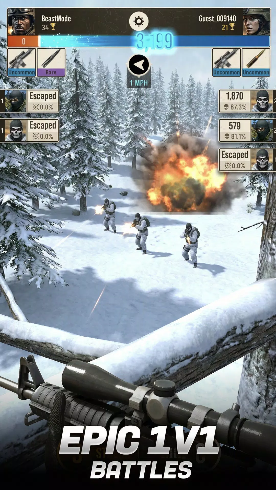 2. 一对一战术对决:能与世界各地真实玩家激烈对抗,每枪都关键,考验战术与技巧。