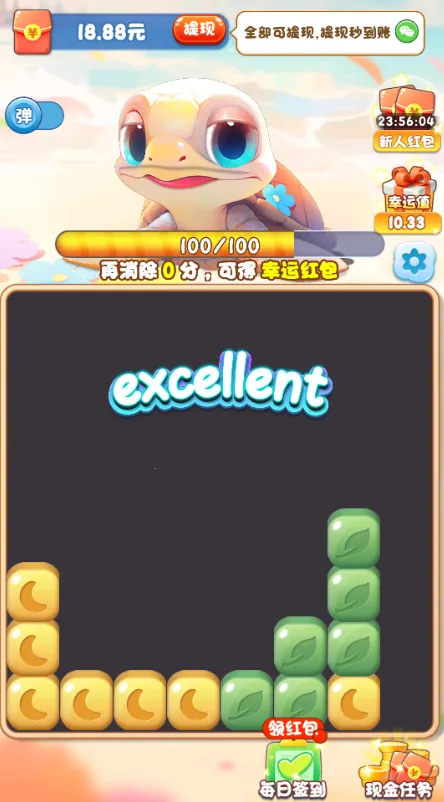 想找一款能轻松解压还能赚红包的游戏吗?那海底大碰撞红包版绝对适合你!这是一款超有趣的消除游戏。它有着经典的游戏模式,能让你携手冒险完成任务,通过消除组合通关还能拿红包奖励。丰富类型的无限级别挑战等你来,各种令人兴奋的关卡和冒险,轻松赚红包不是梦。游戏亮点满满,荣耀关卡等你完成赚红包,简单流畅易上手,点击多个相同颜色形状就能消除,还有红包掉落。绚丽的角色场景画面,端游级的流畅体验,同一图形可连击去除。在这里,你能体验高度自由的消去玩法,感受轻松放松的淘汰任务,享受多彩非凡的冒险突破趣味,赶紧来海底大碰撞红包版,一边解压一边赚零花吧!